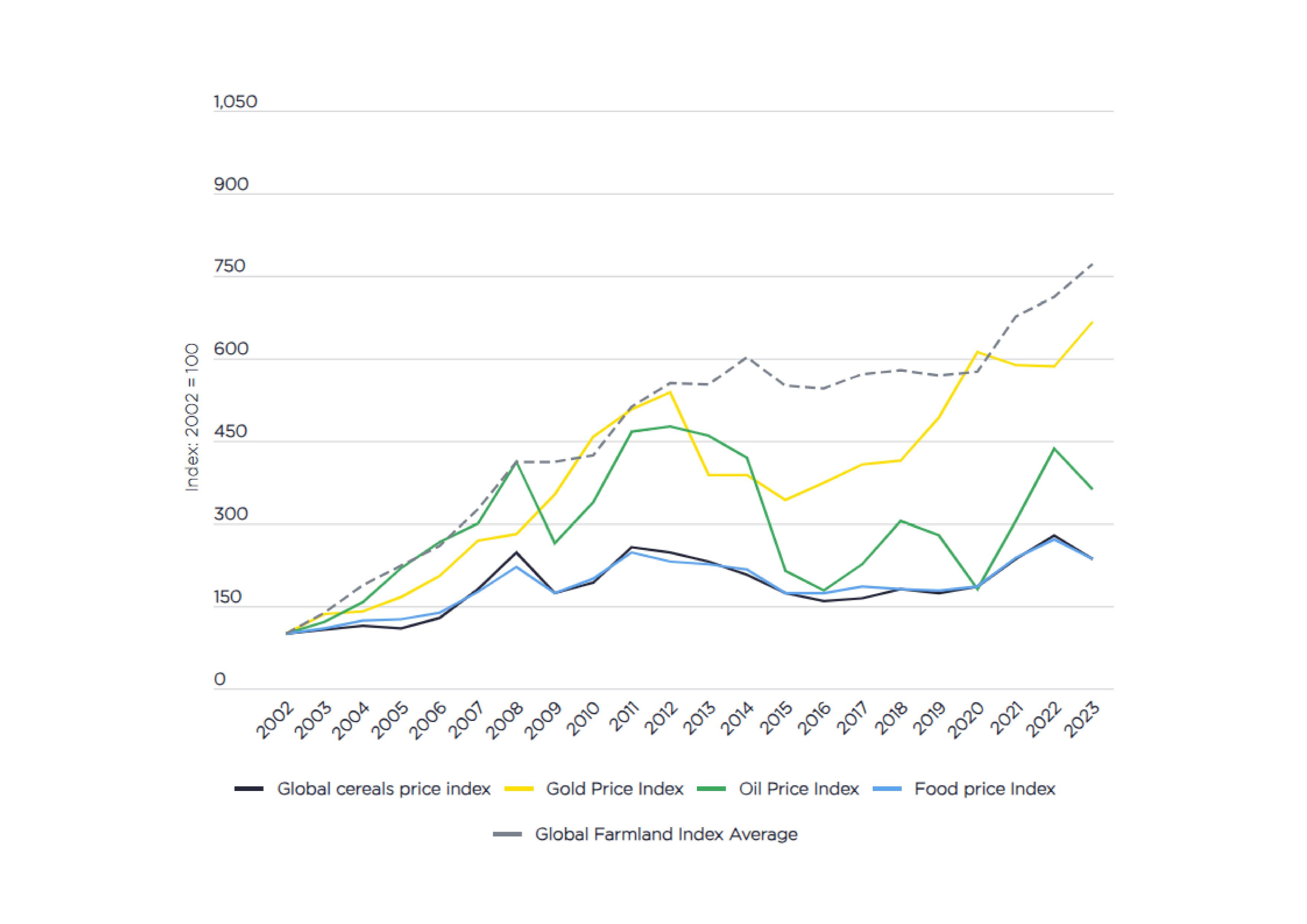 The appeal of farmland for investors becomes even clearer when looking at long-term return trends. Farmland has consistently outperformed key commodities like gold, oil, and agricultural products—making it an increasingly attractive asset class (as widely documented on this website). Farmland markets in 2023 grew at an average rate of 8.5%, delivering higher returns than food, oil, or gold.